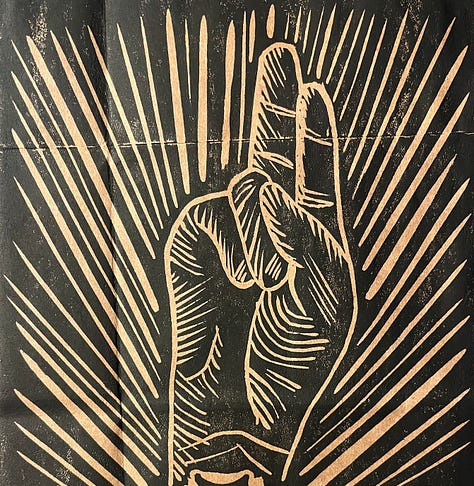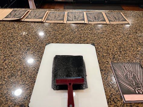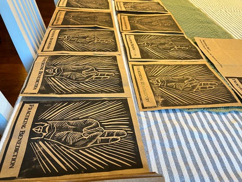 The booklet I wrote or compiled is entitled: Practicing Benediction. I asked for brown paper bag donations from the folks at Trinity, cut them to size to be used as the cover for this booklet. I had just been in Wilmore, KY with my friend Winfield Bevins, and saw the most beautiful linocuts that he had done of various saints, so (literally) I tried my own hand at a linocut to print on each cover. Here was the process: